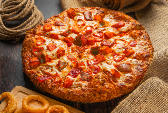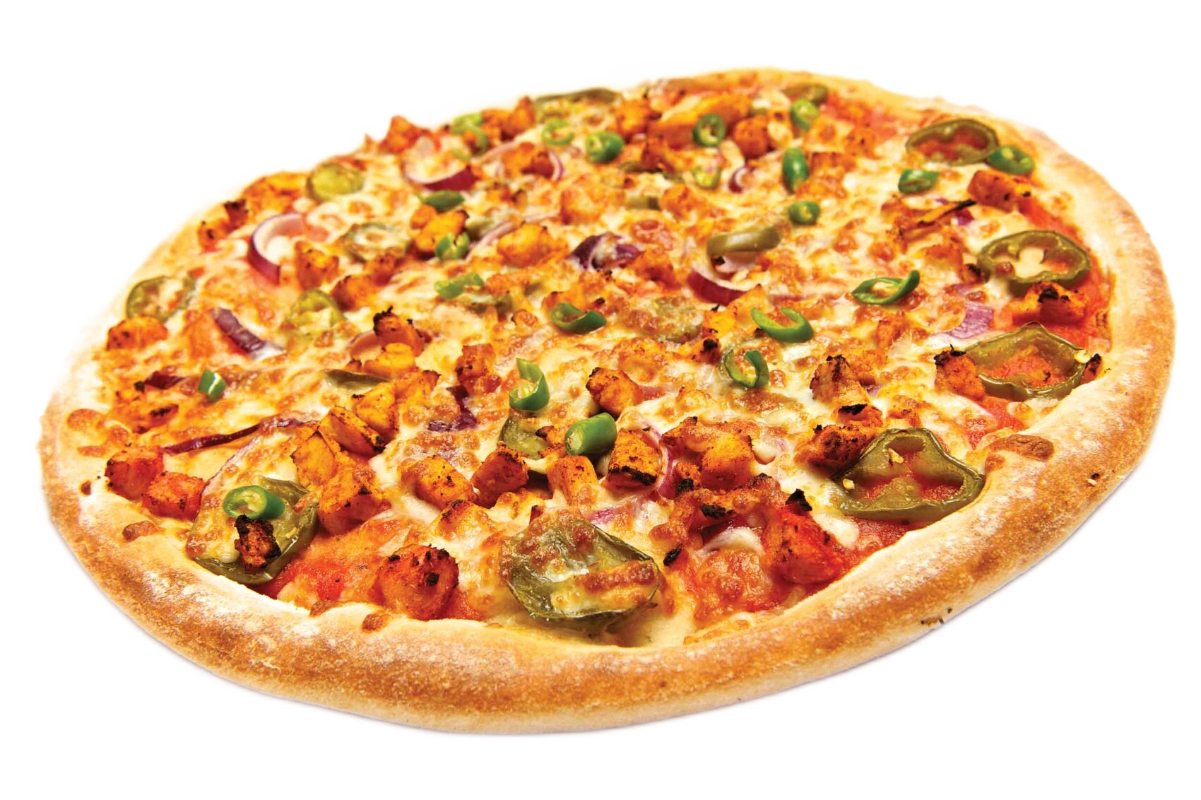 Blend of Tandoori and Marinara Sauce, Mozzarella, Cubes of Cottage Cheese, Red Onions, Green Peppers, and Hot Peppers
